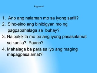 1 Ang pinakapayak na paraan ay ang pagturan o pagsasabi ng salamat sa ipinakitang kabutihan ng ibang tao. Kaya nararapat lang na magpasalamat ka rin sa mabuting nagawa sa yo ng iyong kapwa. Nasusuri ang mga halimbawa o sitwasyon na nagpapakita ng pasasalamat o kawalan nito.