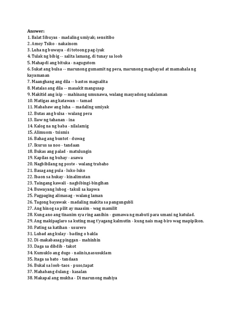 Kalog na ng baba - nilalamig4. Bahag ang buntot - duwag6. Nagbibilang ng poste - walang trabaho10.